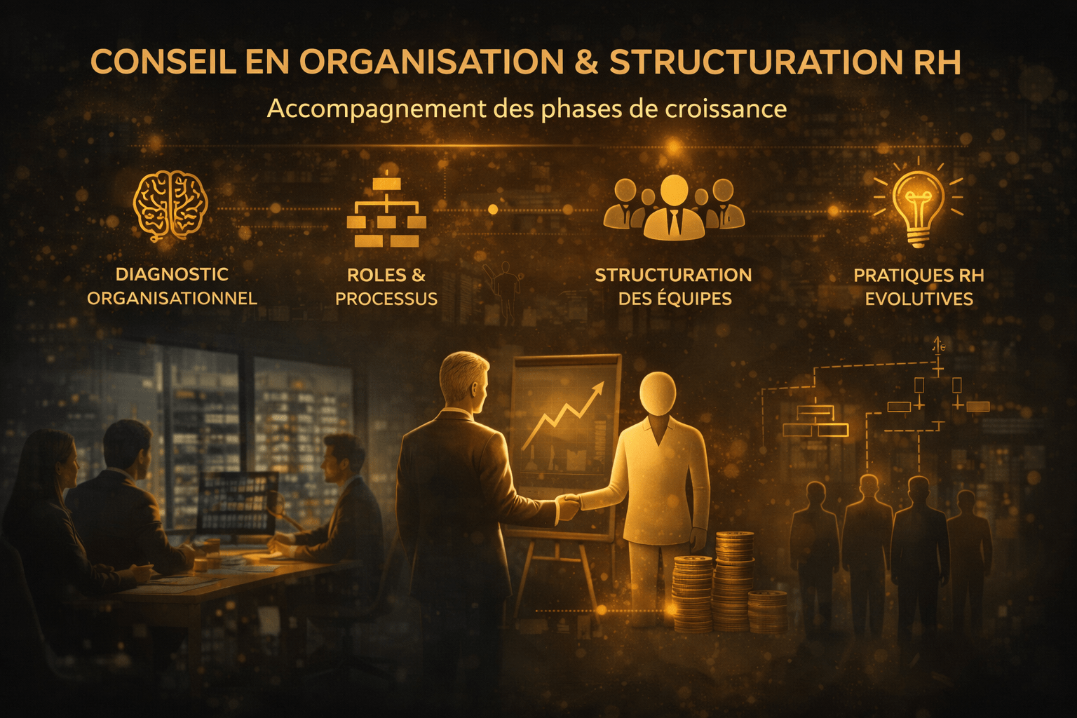 Organigrammes, fonctions clés, process RH, accompagnement du changement